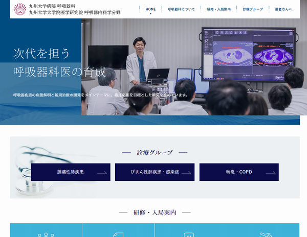 この度、九州大学病院 呼吸器科のWEBサイトをリニューアルいたしました。新しいWEBサイトは、スマートフォン対策も実施し、最新のお知らせ情報や、臨床研究などの情報を開示しています。また入局をご検討の医学生、若手医師に向けたメッセージも提示しましたので、ぜひご覧ください。